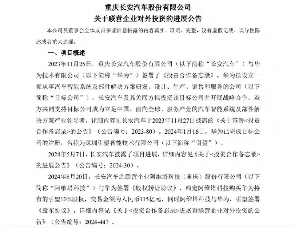 2024年8月,阿维塔科技与华为签署《股权转让协议》,约定阿维塔科技购买华为持有的引望10%股权。