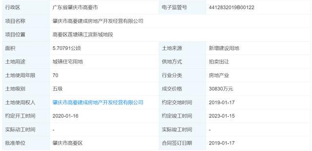 该地块位于高要区莲塘镇江滨新城地段,面积为19003.7平,用途为普通商品住房,约定动工时间为2022年12月23日。
