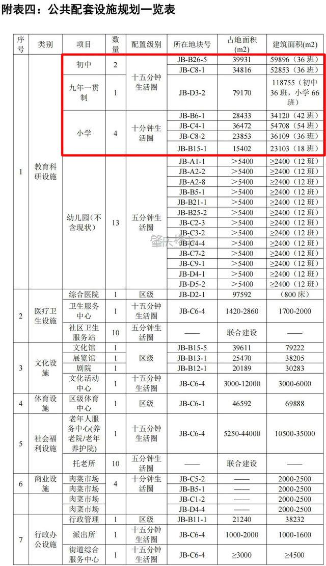 整个江滨新城拟设1所九年一贯制学校、2所初中、4所小学、1所综合医院、1处区级体育中心、多处肉菜市场等。