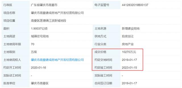 公司成立次年,即2019年,高要建成公司以拍卖出让的方式摘得该宗商住地,成交价10270万元。